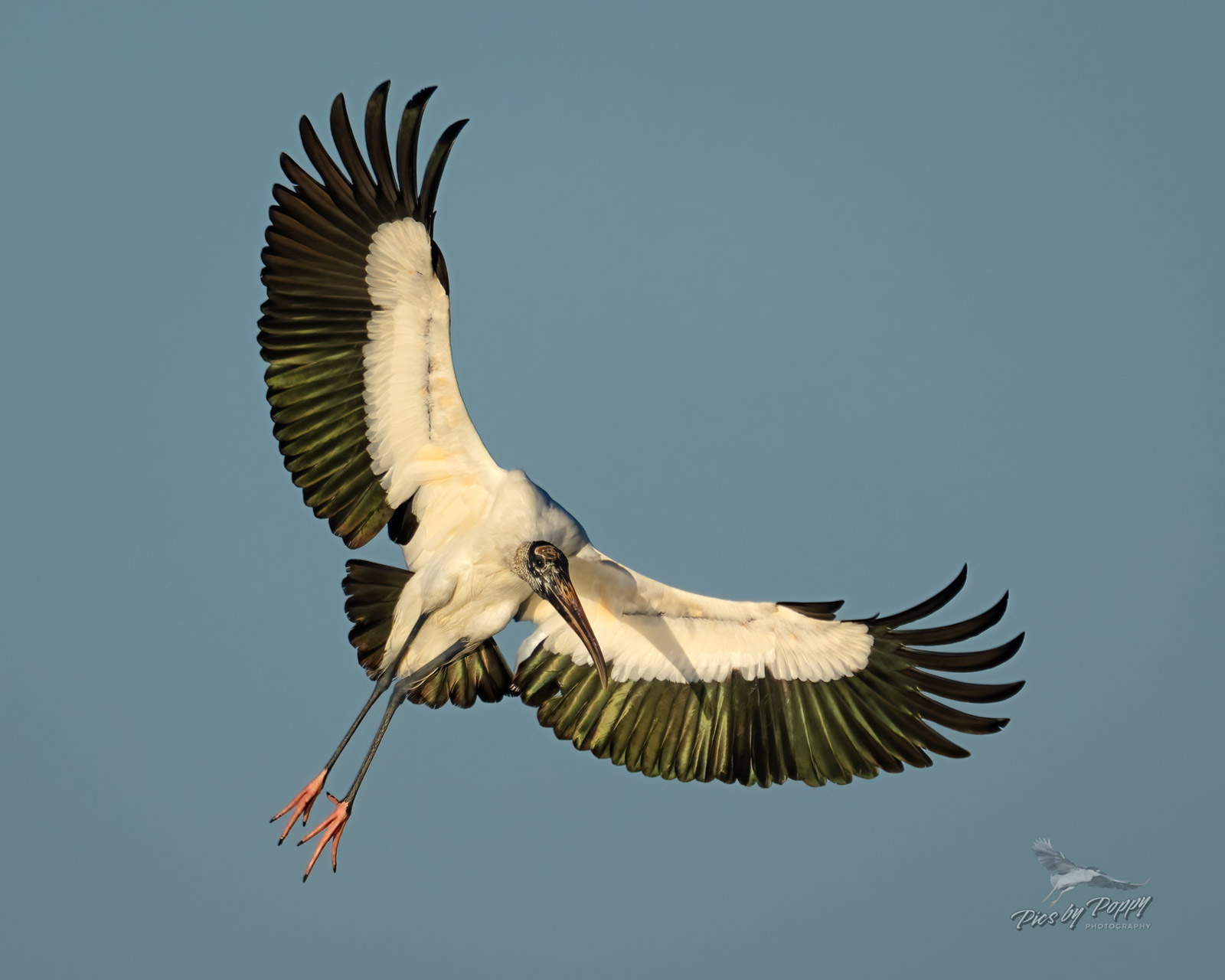 During this time, we also had the treat of the arrival of 3 Wood Storks, all flying in and landing in a small group of mangroves in the center of this large water pool. I was able to grab a capture of one the storks coming in for a landing, spreading its wings full in the bright sunlight. I love the contrast of their white and dark feathers and how their feathers will show their glossy reflections sporting their beautiful iridescence.